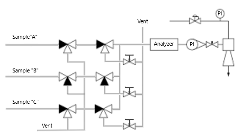 The block and bleed is a commonly used for a multi-sample system. Which of the configurations below best relates to the diagram below?